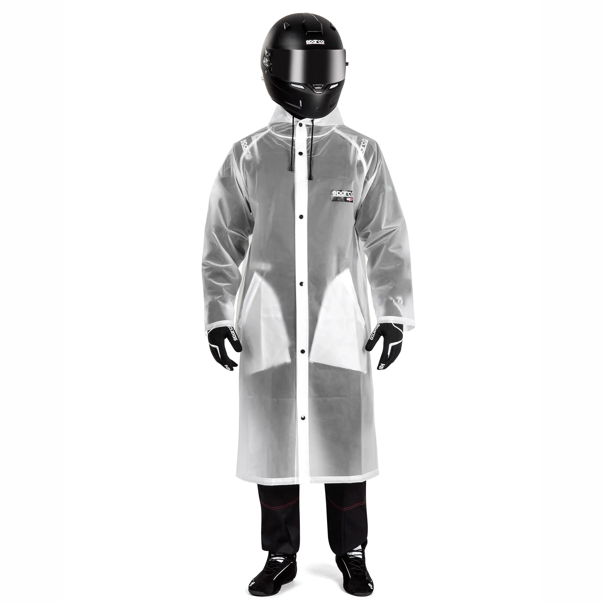 Το Sparco Evo είναι κατασκευασμένο από 100% αδιάβροχη και διαφανή θερμοπλαστική πολυουρεθάνη, ώστε να είναι ιδανικό για να σας κρατά στεγνούς στο χώρο του paddock τις βροχερές ημέρες. Διαθέτει κουκούλα με γείσο και κορδόνι και πλαϊνές τσέπες με πτερύγια για να διατηρείται το περιεχόμενο στεγνό.